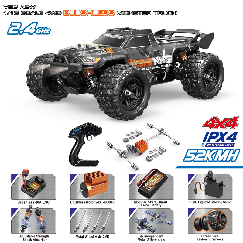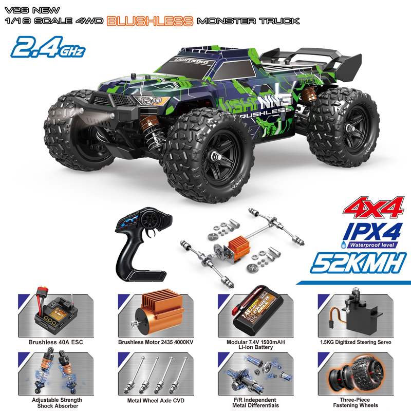 Description: 1/182.4G Brushless RC Big Wheels Climbing Truck 52KM/H Off-road High Speed Car With lights