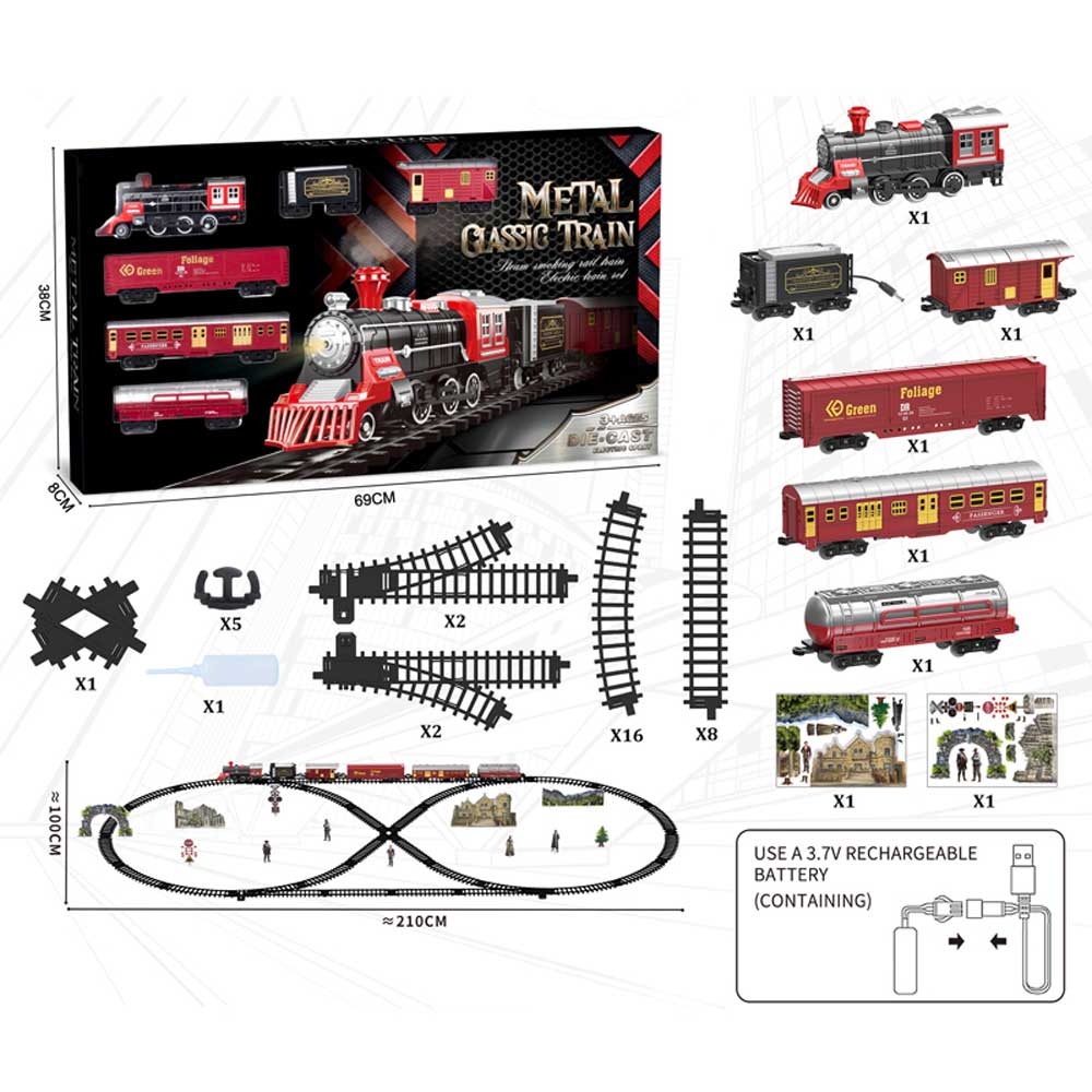 Description: Electric Alloy Spray Train Set Retro DIY Assembly Railway Track Car Kids Toy with Light&Music